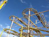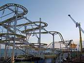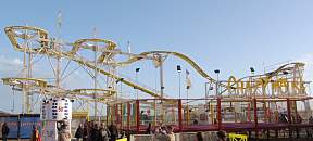 Diese Wilde Maus hat frei drehende Gondeln, was je nach Beladung der Chaisen zu recht wilden Fahrten führen kann. Und da alle Fahrgäste in der ersten Reihe sitzen, sitzen zwei ganz weit außen und damit schon neben der Schiene: Das ergibt zusammen mit der Lage am hintersten Ende der Seebrücke eine tolle Aussicht! Und die engen Kurven kommen dadurch extra gut rüber.