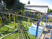Powered Coaster mit eng am Blauen Enzian von Mack in transportabler Ausführung orientiertem Layout. Auch das Fahrgefühl ist grundsätzlich vergleichbar, wenngleich die Fahrt in Luneur unangenehm ruppig war.